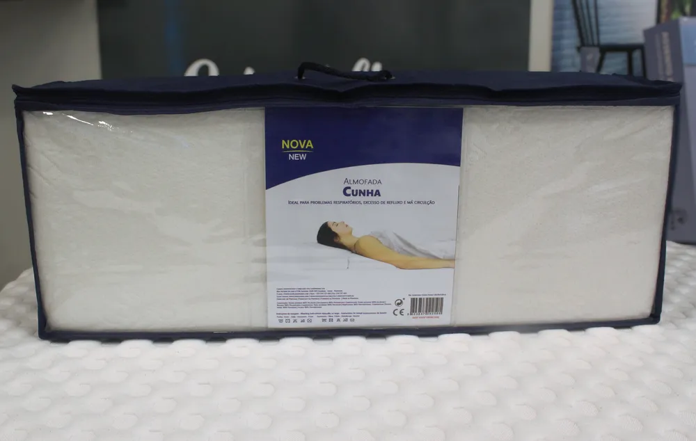 Almofada inclinada desenvolvida para ajudar a manter a parte superior do corpo elevada durante o descanso.